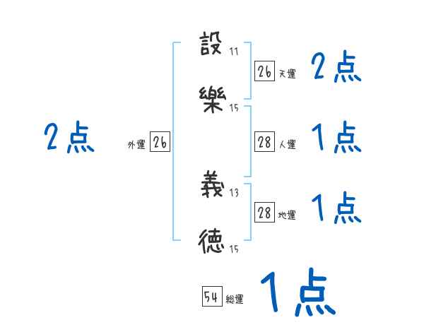 外運![]() | 設樂義徳さんの外運は26画の2つ星!波瀾万丈かも。信頼できる人を大事にしましょう。 生活面を象徴する運勢です。外部から受ける影響力を表し、結婚運、家庭運や職場、環境への順応性を表します。 |