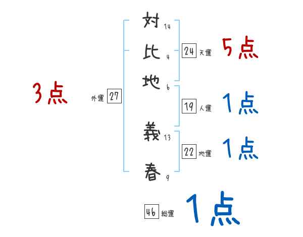 人運![]() | 対比地義春さんの人運は19画の1つ星!優れた才能を持ちますが、協調性が足りないことも。周りの人と協力する事を意識しましょう。 性格や才能などを表す2番目に重要な運勢です。人間関係や協調性、社会的な成功に影響します。主に20歳から50歳ぐらいまでの中年期の運勢を表します。 |