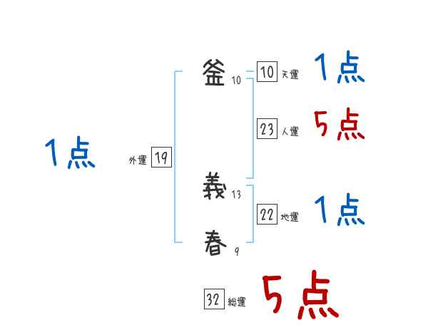 総運![]() | 釜義春さんの総運は32画の5つ星!柔軟性があり成功する。チャンスが多く金運が良い。 あなたの人生を表す1番重要な運勢です。生涯を通じて影響する総合運となり、主に50歳以降の晩年期に影響を及ぼします。 |