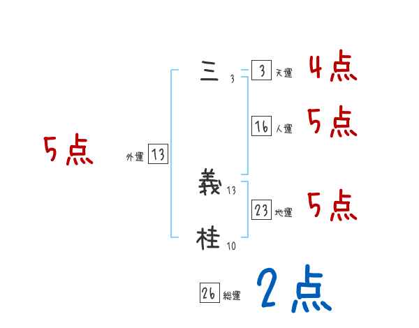 天運![]() | 三義桂さんの天運は3画の4つ星!活動的で才能に恵まれ、多くの信頼を得る。希望に満ち成長する。 家系が持つ宿命的な運勢を表します。祖先から受け継いだ苗字ですので自分の力が及びません。家柄を象徴します。 |