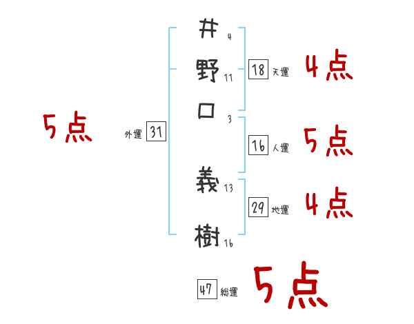 総運![]() | 井野口義樹さんの総運は47画の5つ星!実力が開花し発展する円満な人生。財に恵まれる。 あなたの人生を表す1番重要な運勢です。生涯を通じて影響する総合運となり、主に50歳以降の晩年期に影響を及ぼします。 |