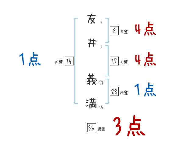 天運![]() | 友井義満さんの天運は8画の4つ星!勤勉家。根気強く努力し成功する。忍耐力がある。 家系が持つ宿命的な運勢を表します。祖先から受け継いだ苗字ですので自分の力が及びません。家柄を象徴します。 |