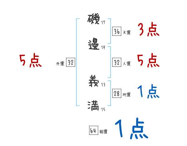 外運![]() | 磯邊義満さんの外運は32画の5つ星!柔軟性があり成功する。チャンスが多く金運が良い。 生活面を象徴する運勢です。外部から受ける影響力を表し、結婚運、家庭運や職場、環境への順応性を表します。 |
