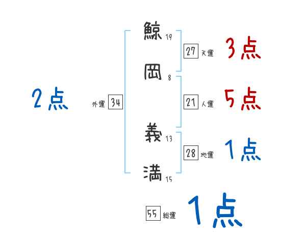 天運![]() | 鯨岡義満さんの天運は27画の3つ星!頭脳明晰だが強情で摩擦が多い傾向。孤立に注意。 家系が持つ宿命的な運勢を表します。祖先から受け継いだ苗字ですので自分の力が及びません。家柄を象徴します。 |