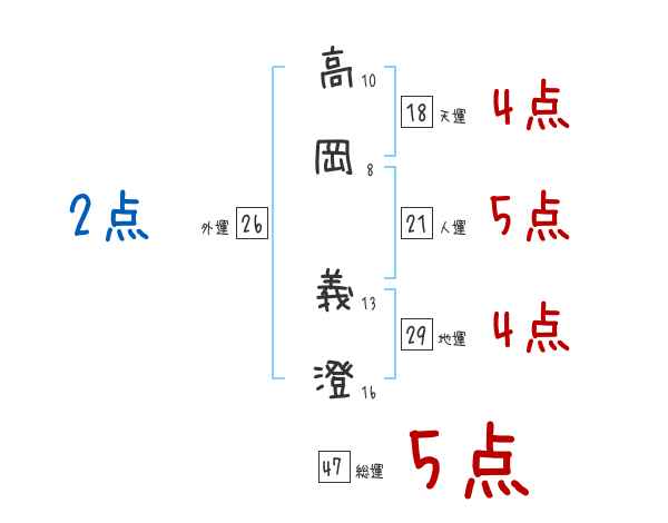 総運![]() | 高岡義澄さんの総運は47画の5つ星!実力が開花し発展する円満な人生。財に恵まれる。 あなたの人生を表す1番重要な運勢です。生涯を通じて影響する総合運となり、主に50歳以降の晩年期に影響を及ぼします。 |