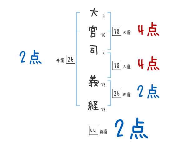 外運![]() | 大宮司義経さんの外運は26画の2つ星!波瀾万丈かも。信頼できる人を大事にしましょう。 生活面を象徴する運勢です。外部から受ける影響力を表し、結婚運、家庭運や職場、環境への順応性を表します。 |