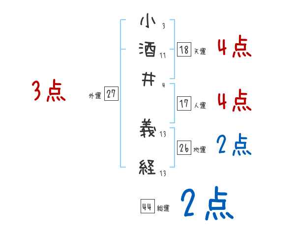 天運![]() | 小酒井義経さんの天運は18画の4つ星!情熱的で剛気。忍耐力があり信頼される。 家系が持つ宿命的な運勢を表します。祖先から受け継いだ苗字ですので自分の力が及びません。家柄を象徴します。 |