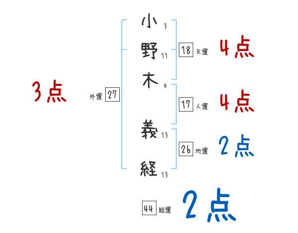 天運![]() | 小野木義経さんの天運は18画の4つ星!情熱的で剛気。忍耐力があり信頼される。 家系が持つ宿命的な運勢を表します。祖先から受け継いだ苗字ですので自分の力が及びません。家柄を象徴します。 |