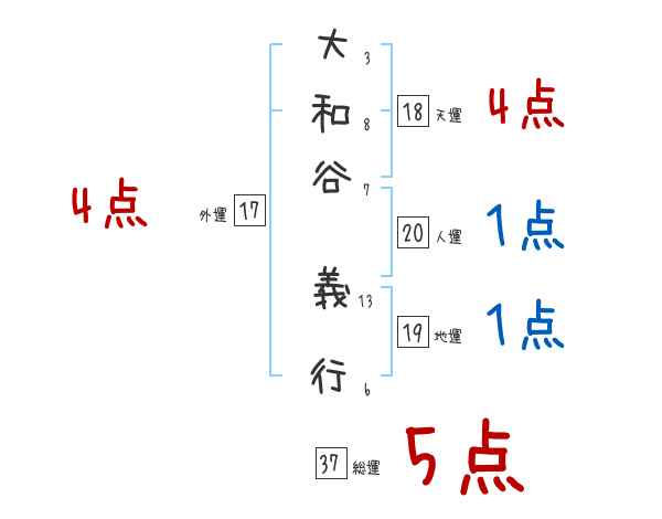 天運![]() | 大和谷義行さんの天運は18画の4つ星!情熱的で剛気。忍耐力があり信頼される。 家系が持つ宿命的な運勢を表します。祖先から受け継いだ苗字ですので自分の力が及びません。家柄を象徴します。 |