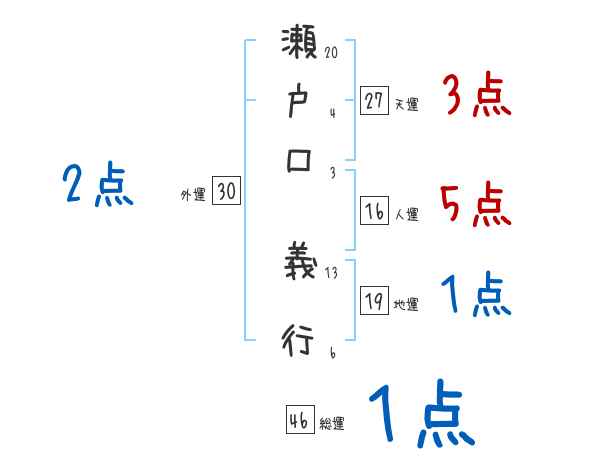 総運![]() | 瀬戸口義行さんの総運は46画の1つ星!迷走することが多く苦労するかも。目先のことにとらわれないように。 あなたの人生を表す1番重要な運勢です。生涯を通じて影響する総合運となり、主に50歳以降の晩年期に影響を及ぼします。 |