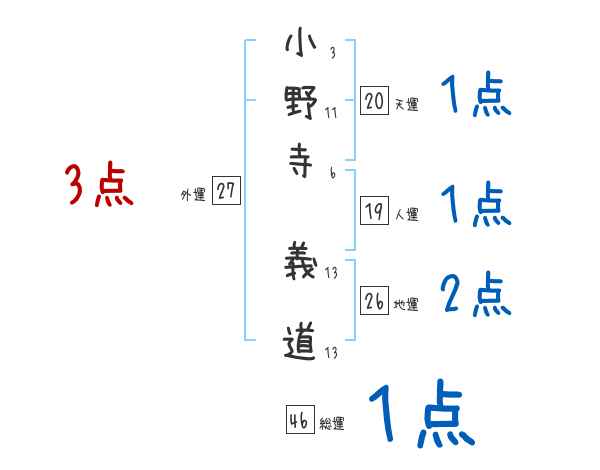 総運![]() | 小野寺義道さんの総運は46画の1つ星!迷走することが多く苦労するかも。目先のことにとらわれないように。 あなたの人生を表す1番重要な運勢です。生涯を通じて影響する総合運となり、主に50歳以降の晩年期に影響を及ぼします。 |