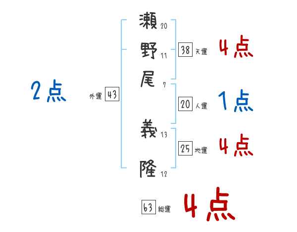総運![]() | 瀬野尾義隆さんの総運は63画の4つ星!家庭運がよく順調な生活。温和な性格。 あなたの人生を表す1番重要な運勢です。生涯を通じて影響する総合運となり、主に50歳以降の晩年期に影響を及ぼします。 |