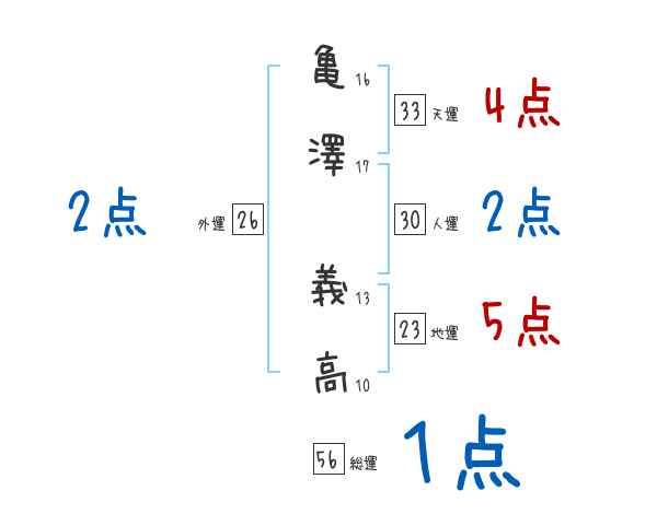 天運![]() | 亀澤義高さんの天運は33画の4つ星!権力志向でプライドが高い。勇気があり運を切り開き成功する。 家系が持つ宿命的な運勢を表します。祖先から受け継いだ苗字ですので自分の力が及びません。家柄を象徴します。 |