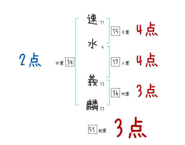 外運![]() | 速水義麟さんの外運は34画の2つ星!独創性に優れるが、自尊心が強く災難に注意しましょう。 生活面を象徴する運勢です。外部から受ける影響力を表し、結婚運、家庭運や職場、環境への順応性を表します。 |