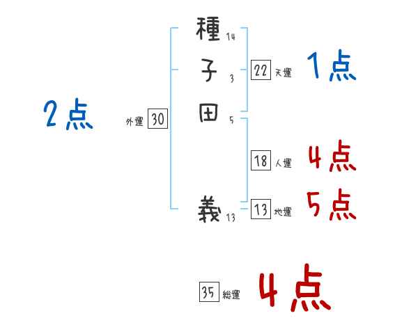 総運![]() | 種子田義さんの総運は35画の4つ星!温厚な性格で感受性が高い。穏和な性格で人望が厚い。 あなたの人生を表す1番重要な運勢です。生涯を通じて影響する総合運となり、主に50歳以降の晩年期に影響を及ぼします。 |