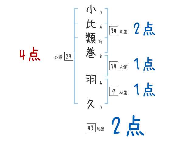 総運![]() | 小比類巻羽久さんの総運は43画の2つ星!頑固な性格で独立心が強いかも。やや非現実的で浪費に注意しましょう。 あなたの人生を表す1番重要な運勢です。生涯を通じて影響する総合運となり、主に50歳以降の晩年期に影響を及ぼします。 |
