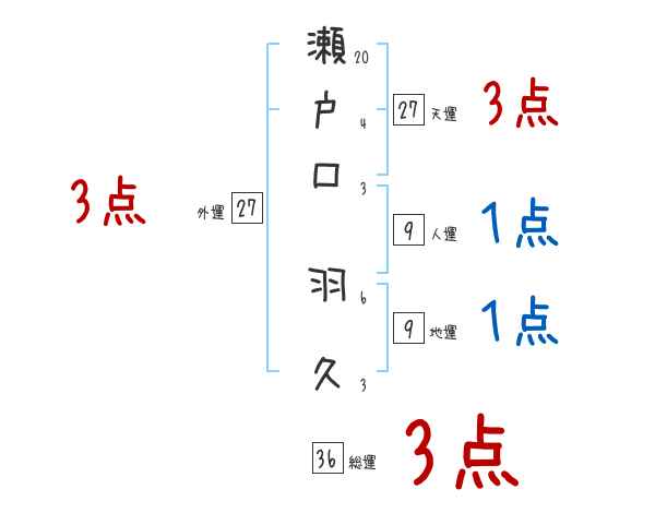 | 総運  | 瀬戸口羽久さんの総運は36画の3つ星!先見性が豊かです。多少神経質で苦労することも。あなたの人生を表す1番重要な運勢です。生涯を通じて影響する総合運となり、主に50歳以降の晩年期に影響を及ぼします。 |