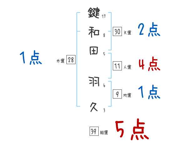 外運![]() | 鍵和田羽久さんの外運は28画の1つ星!家庭環境に注意。スポーツで活躍できる能力があるかも。 生活面を象徴する運勢です。外部から受ける影響力を表し、結婚運、家庭運や職場、環境への順応性を表します。 |