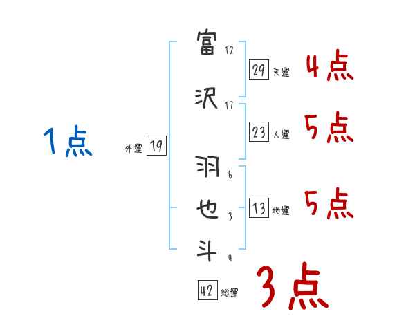 総運![]() | 富沢羽也斗さんの総運は42画の3つ星!病気に注意。多芸であるが消極的でおとなしい。 あなたの人生を表す1番重要な運勢です。生涯を通じて影響する総合運となり、主に50歳以降の晩年期に影響を及ぼします。 |