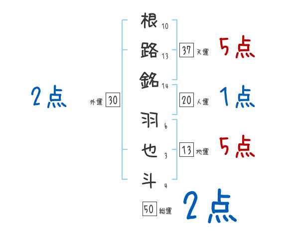 外運![]() | 根路銘羽也斗さんの外運は30画の2つ星!浮き沈みの激しさに注意しましょう。 生活面を象徴する運勢です。外部から受ける影響力を表し、結婚運、家庭運や職場、環境への順応性を表します。 |