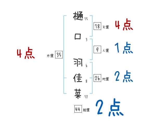 外運![]() | 樋口羽佳菜さんの外運は35画の4つ星!温厚な性格で感受性が高い。穏和な性格で人望が厚い。 生活面を象徴する運勢です。外部から受ける影響力を表し、結婚運、家庭運や職場、環境への順応性を表します。 |