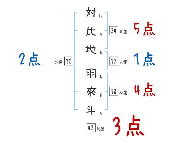 外運![]() | 対比地羽來斗さんの外運は30画の2つ星!浮き沈みの激しさに注意しましょう。 生活面を象徴する運勢です。外部から受ける影響力を表し、結婚運、家庭運や職場、環境への順応性を表します。 |