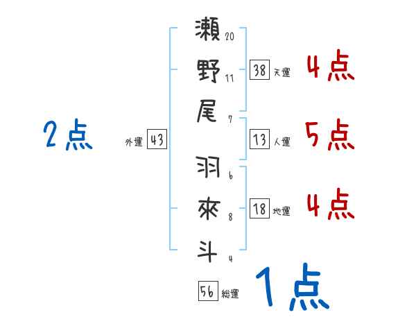 総運![]() | 瀬野尾羽來斗さんの総運は56画の1つ星!消極的で無気力になりがち。誠実な気持ちが必要でしょう。 あなたの人生を表す1番重要な運勢です。生涯を通じて影響する総合運となり、主に50歳以降の晩年期に影響を及ぼします。 |