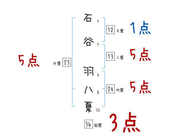 天運![]() | 石谷羽八夏さんの天運は12画の1つ星!簡単な失敗で諦めてしまいやすいかも。着実に行動すると良いでしょう。 家系が持つ宿命的な運勢を表します。祖先から受け継いだ苗字ですので自分の力が及びません。家柄を象徴します。 |