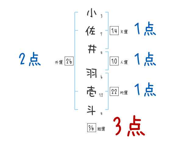 総運![]() | 小佐井羽壱斗さんの総運は36画の3つ星!先見性が豊かです。多少神経質で苦労することも。 あなたの人生を表す1番重要な運勢です。生涯を通じて影響する総合運となり、主に50歳以降の晩年期に影響を及ぼします。 |