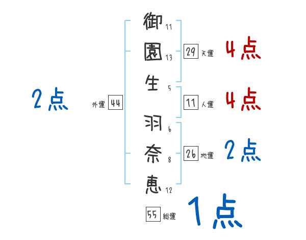 外運![]() | 御園生羽奈恵さんの外運は44画の2つ星!誠実で慎重な性格。物事を考えすぎないように注意しましょう。 生活面を象徴する運勢です。外部から受ける影響力を表し、結婚運、家庭運や職場、環境への順応性を表します。 |