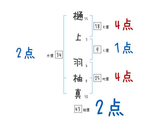 天運![]() | 樋上羽柚真さんの天運は18画の4つ星!情熱的で剛気。忍耐力があり信頼される。 家系が持つ宿命的な運勢を表します。祖先から受け継いだ苗字ですので自分の力が及びません。家柄を象徴します。 |