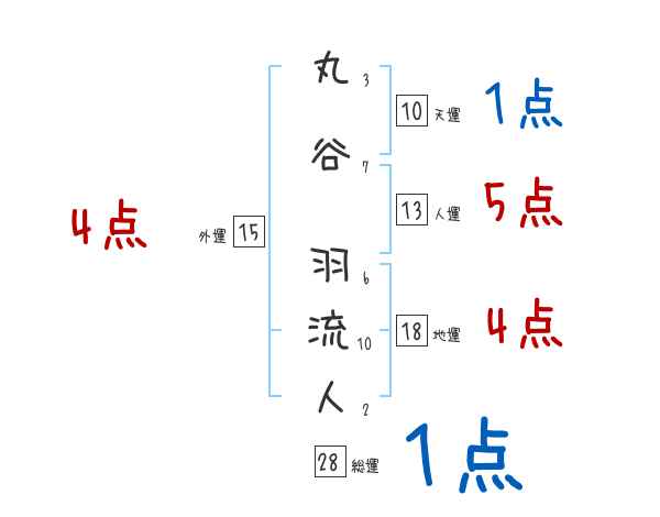 総運![]() | 丸谷羽流人さんの総運は28画の1つ星!家庭環境に注意。スポーツで活躍できる能力があるかも。 あなたの人生を表す1番重要な運勢です。生涯を通じて影響する総合運となり、主に50歳以降の晩年期に影響を及ぼします。 |