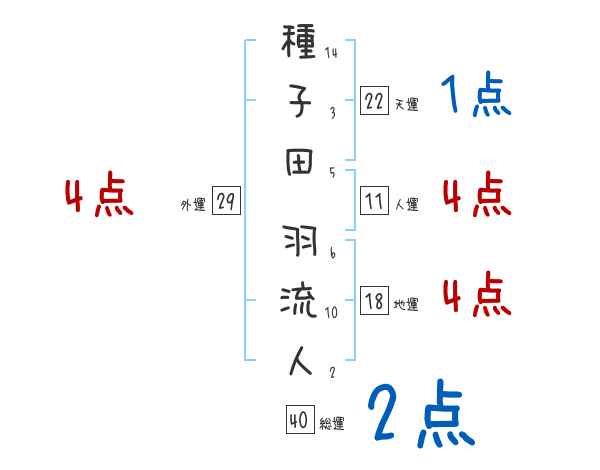 総運![]() | 種子田羽流人さんの総運は40画の2つ星!自信過剰で物事に固執するためトラブルに注意。 あなたの人生を表す1番重要な運勢です。生涯を通じて影響する総合運となり、主に50歳以降の晩年期に影響を及ぼします。 |
