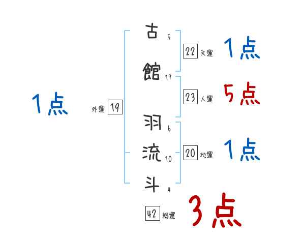 天運![]() | 古館羽流斗さんの天運は22画の1つ星!努力することが苦手ないっぽう手先が器用。芸術性にも優れる。 家系が持つ宿命的な運勢を表します。祖先から受け継いだ苗字ですので自分の力が及びません。家柄を象徴します。 |