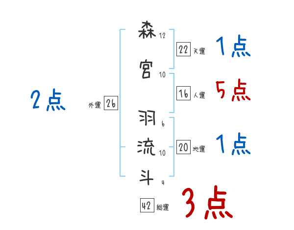 外運![]() | 森宮羽流斗さんの外運は26画の2つ星!波瀾万丈かも。信頼できる人を大事にしましょう。 生活面を象徴する運勢です。外部から受ける影響力を表し、結婚運、家庭運や職場、環境への順応性を表します。 |