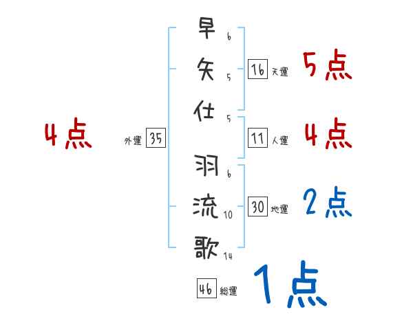 天運![]() | 早矢仕羽流歌さんの天運は16画の5つ星!人望が厚く大きく発展する。逆転成功が見える。 家系が持つ宿命的な運勢を表します。祖先から受け継いだ苗字ですので自分の力が及びません。家柄を象徴します。 |