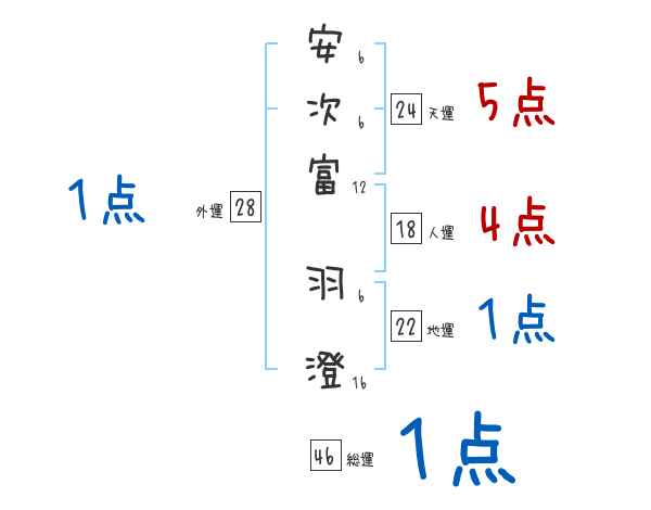 天運![]() | 安次富羽澄さんの天運は24画の5つ星!家庭運が良く順調な人生。金運にも恵まれる。 家系が持つ宿命的な運勢を表します。祖先から受け継いだ苗字ですので自分の力が及びません。家柄を象徴します。 |