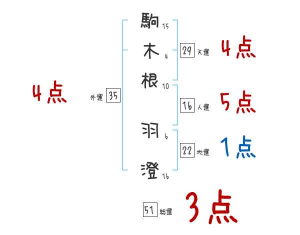 外運![]() | 駒木根羽澄さんの外運は35画の4つ星!温厚な性格で感受性が高い。穏和な性格で人望が厚い。 生活面を象徴する運勢です。外部から受ける影響力を表し、結婚運、家庭運や職場、環境への順応性を表します。 |