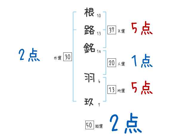 総運![]() | 根路銘羽玖さんの総運は50画の2つ星!浮き沈みが激しく不安定。しりすぼみに衰退しやすいので注意しましょう。 あなたの人生を表す1番重要な運勢です。生涯を通じて影響する総合運となり、主に50歳以降の晩年期に影響を及ぼします。 |