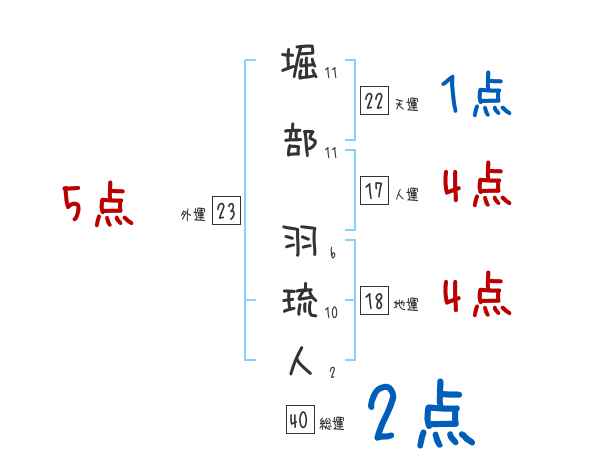 天運![]() | 堀部羽琉人さんの天運は22画の1つ星!努力することが苦手ないっぽう手先が器用。芸術性にも優れる。 家系が持つ宿命的な運勢を表します。祖先から受け継いだ苗字ですので自分の力が及びません。家柄を象徴します。 |