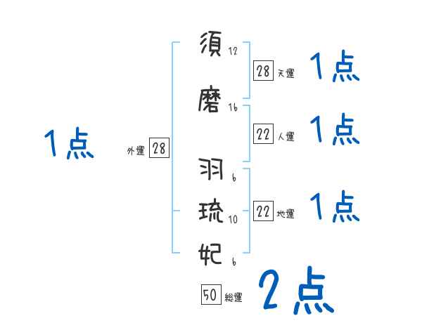 天運![]() | 須磨羽琉妃さんの天運は28画の1つ星!家庭環境に注意。スポーツで活躍できる能力があるかも。 家系が持つ宿命的な運勢を表します。祖先から受け継いだ苗字ですので自分の力が及びません。家柄を象徴します。 |