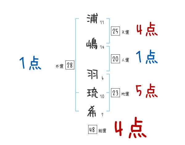 天運![]() | 浦嶋羽琉希さんの天運は25画の4つ星!個性があり才能があふれる。強運の持ち主で発展する。 家系が持つ宿命的な運勢を表します。祖先から受け継いだ苗字ですので自分の力が及びません。家柄を象徴します。 |