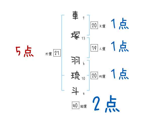 外運![]() | 車塚羽琉斗さんの外運は21画の5つ星!統率力がある。独立し成功する。名誉を手に入れる。 生活面を象徴する運勢です。外部から受ける影響力を表し、結婚運、家庭運や職場、環境への順応性を表します。 |