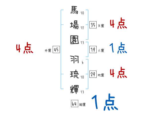 天運![]() | 馬場園羽琉輝さんの天運は35画の4つ星!温厚な性格で感受性が高い。穏和な性格で人望が厚い。 家系が持つ宿命的な運勢を表します。祖先から受け継いだ苗字ですので自分の力が及びません。家柄を象徴します。 |