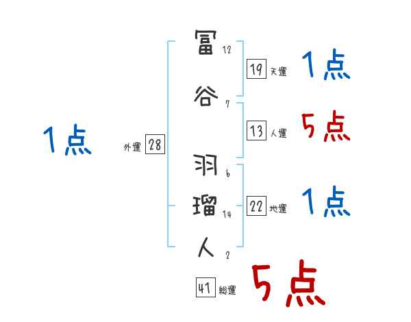 総運![]() | 冨谷羽瑠人さんの総運は41画の5つ星!大志を抱き、目標に向かって実力を発揮し達成する。温和な性格。 あなたの人生を表す1番重要な運勢です。生涯を通じて影響する総合運となり、主に50歳以降の晩年期に影響を及ぼします。 |