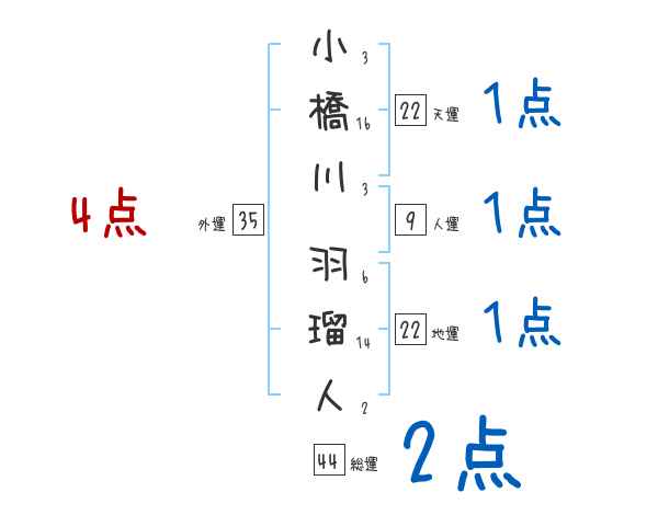天運![]() | 小橋川羽瑠人さんの天運は22画の1つ星!努力することが苦手ないっぽう手先が器用。芸術性にも優れる。 家系が持つ宿命的な運勢を表します。祖先から受け継いだ苗字ですので自分の力が及びません。家柄を象徴します。 |