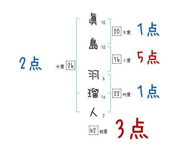 人運![]() | 眞島羽瑠人さんの人運は16画の5つ星!人望が厚く大きく発展する。逆転成功が見える。 性格や才能などを表す2番目に重要な運勢です。人間関係や協調性、社会的な成功に影響します。主に20歳から50歳ぐらいまでの中年期の運勢を表します。 |