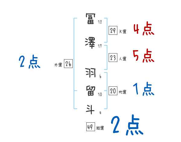 外運![]() | 冨澤羽留斗さんの外運は26画の2つ星!波瀾万丈かも。信頼できる人を大事にしましょう。 生活面を象徴する運勢です。外部から受ける影響力を表し、結婚運、家庭運や職場、環境への順応性を表します。 |
