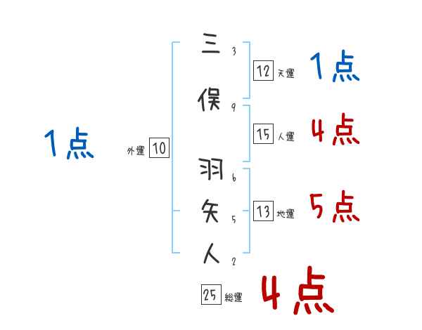 天運![]() | 三俣羽矢人さんの天運は12画の1つ星!簡単な失敗で諦めてしまいやすいかも。着実に行動すると良いでしょう。 家系が持つ宿命的な運勢を表します。祖先から受け継いだ苗字ですので自分の力が及びません。家柄を象徴します。 |