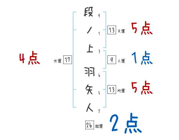 天運![]() | 段ノ上羽矢人さんの天運は13画の5つ星!才能に恵まれ人気がある。名声を手に入れる。円満な人生。 家系が持つ宿命的な運勢を表します。祖先から受け継いだ苗字ですので自分の力が及びません。家柄を象徴します。 |